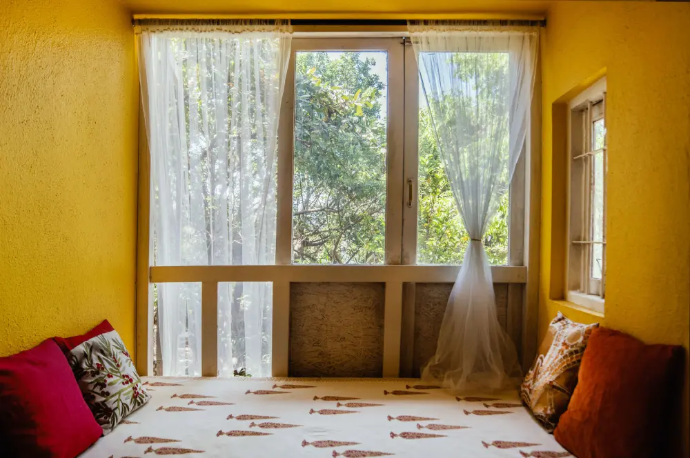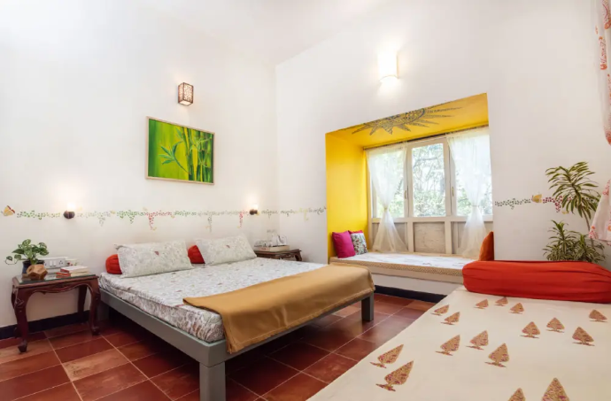 The Lotus Room exudes tranquility with its airy ambiance and vibrant décor. It has ample space for gatherings whether it’s a jam session or a cozy chat. The dedicated workspace, adorned with books, is thoughtfully designed to inspire creativity and productivity.Designed for both relaxation and inspiration, it features a cozy window seat bed and a dedicated work area offering serene views of the lush food forest. The room blends aesthetics with utility, catering to every need. Located near a tranquil lotus pond, the room’s design reflects the elegance and calm of the Lotus flower, offering an inviting retreat that feels both comforting and rejuvenating.